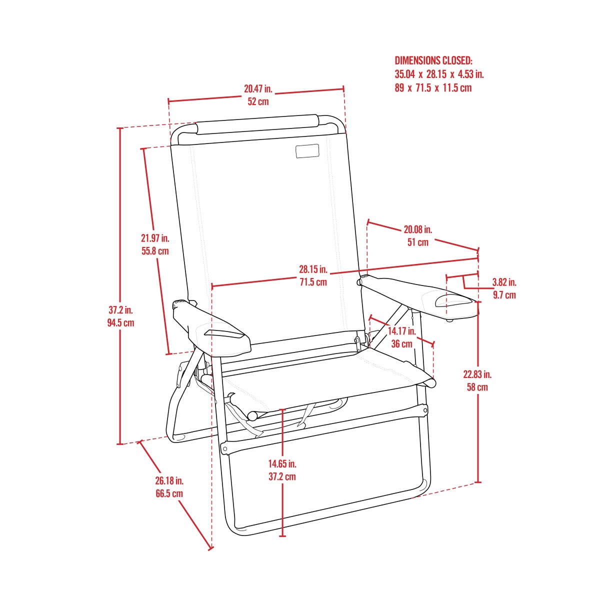Rio Beach 4-POSITION ALUMINUM BEACH & CAMPING CHAIR-38 cm SEAT HEIGHT – FABRIC: POLYESTER – HAS WIDE MOLDED ARMS WITH ANGLED SLOT FOR A PHONE  CASE AND CUP HOLDER, CUP HOLDER AND BOTTLE OPENER IN THE ARMREST – CARRY STRAP – DIMENSIONS: W52*D36*H38/94,5cm – CLOSED PIECE DIMENSIONS: 89×71,5×11,5cm -WEIGHT: 3.63Kg – P/C:8 –