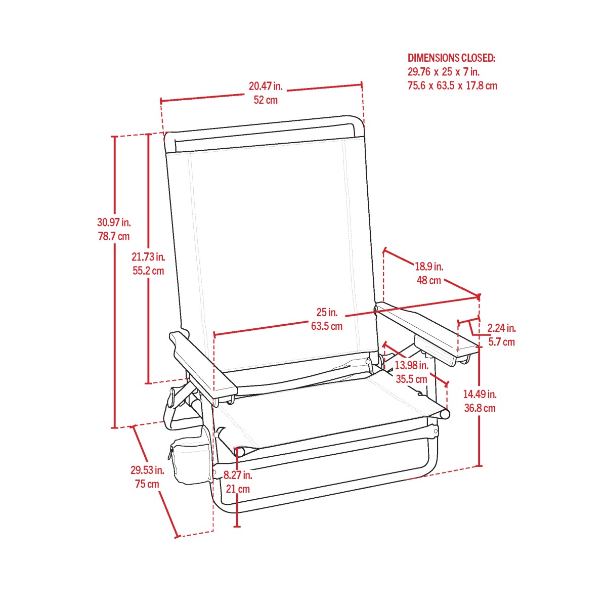 Tommy Bahama- 5 POSITION LAY FLAT BACKPACK BEACH CHAIR – WOODEN ARMS SAFE-ADJUST TECHNOLOGY IN THE ARMS FOR IMPACT PROTECTION-WITH CUSHION – HAS A TOWEL HANGER ON THE BACK-SIDE CASE-ADJUSTABLE CARRY STRAPS- TUBE DIAMETER: ΓΈ mm-WEIGHT TOLERANCE 100 Kg-DIMENSIONS: W52*D35.5*H 21/78,7 cm – CLOSED PIECE DIMENSIONS: 75,6 x 63,5 x 17,8 cm -WEIGHT: 3,5 Kg -GROSS WEIGHT: 6,5 Kg -P/C:4-