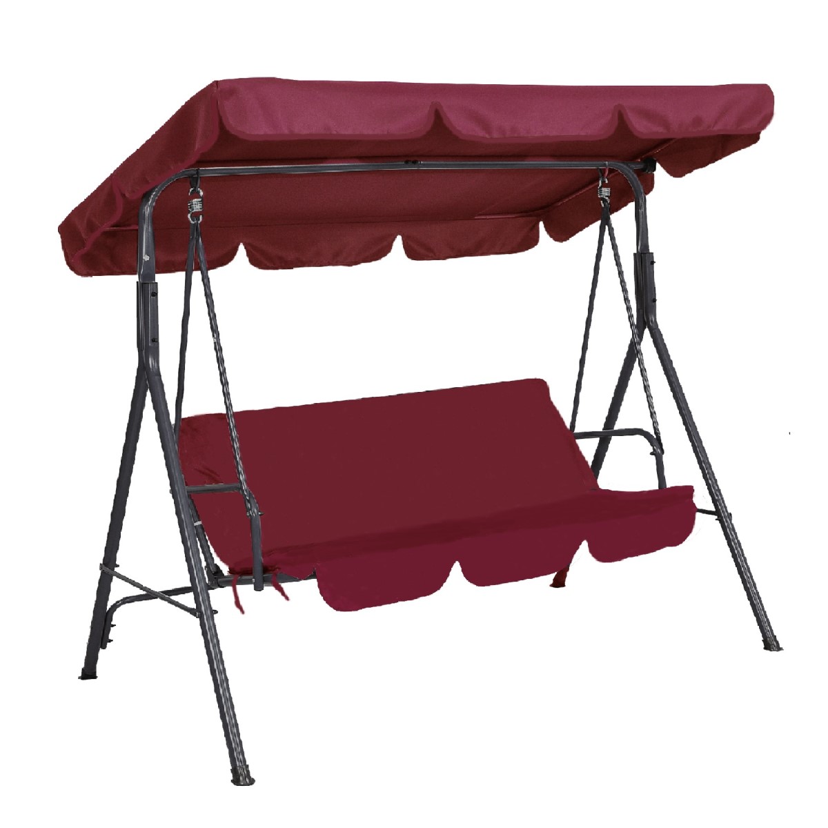 METAL SWING BURGUNDY-CHARCOAL GREY FRAME -REINFORCED- 3 SEATS-DIMENSIONS:L170xD110xH153cm-ONE PIECE TUBE FOR THE CANOPY-SEAT:600Dx300D OXFORD PVC- COVER:160gr WATERPROOF POLYESTER – LEG TUBE: Γ˜38mm- -CUSHION: 6cm/140gr WATERPROOF POLYESTER- WEIGHT: 22 Kg-P/C:1-