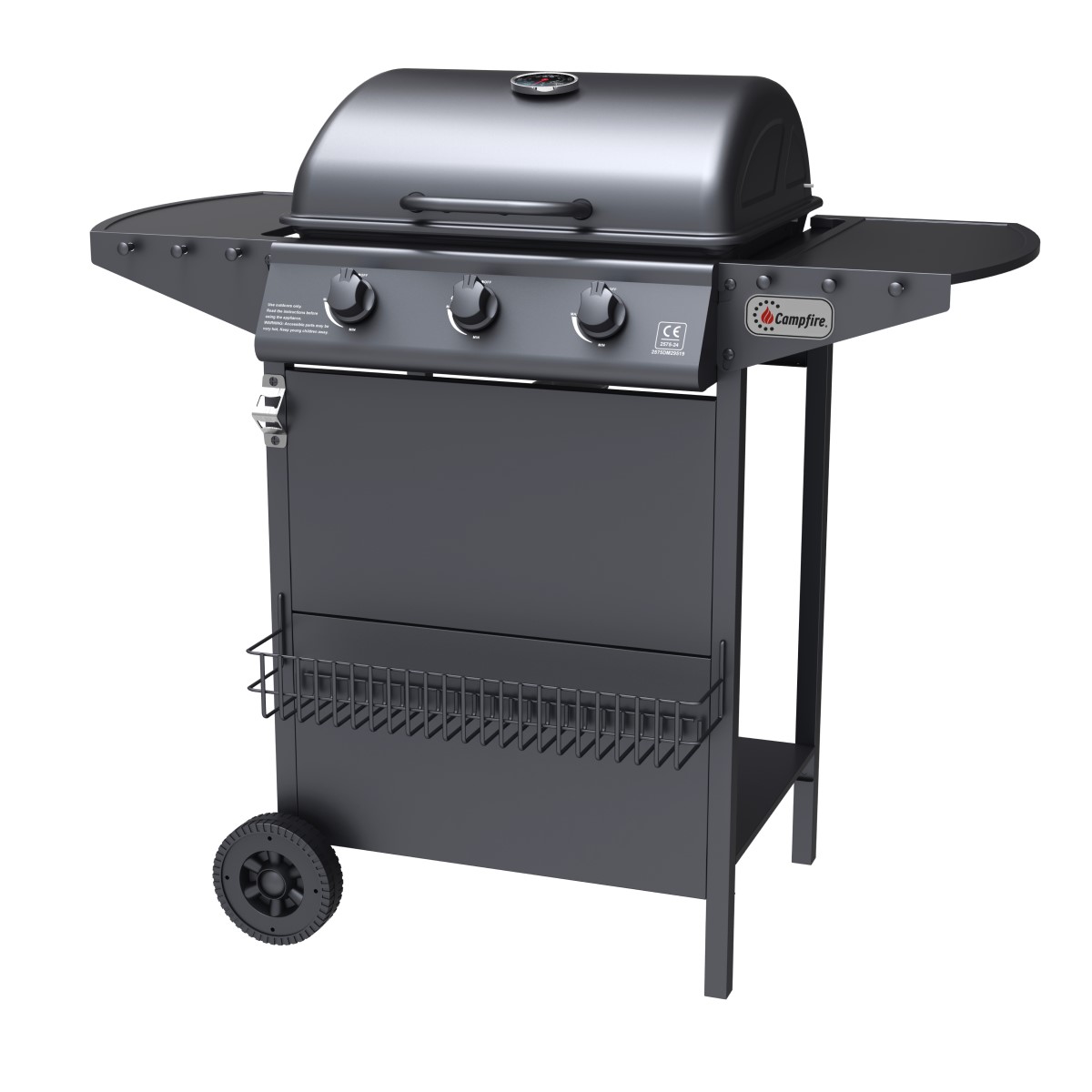 Campfire GAS GRILL  WITH 3 BURNERS-DIMENSIONS:L109xW55,4xH97,7cm- STAINLESS STEEL COOKING AREA : 49Γ—37 cm  COOKING HEIGHT : 82 cm   -RATED HEAT OUTPUT OF MAIN BURNER :9800 BTU/HR 2,9kw -TOTAL POWER: 8,7kw-IGNITION : PIEZO IGNITION -GAS TYPE : LPG -SIDE FOLDING SHELVES WITH 3 HOOKS & OPENER- PRECISION THERMOMETER: INTEGRATED IN THE LID-TROLLEY: STEEL CABIN WITH POWDER PAINT-2 Pcs 6β€³ PP CASTER -FAT COLLECTOR: INCLUDED-REGULATOR & TUBE: NOT INCLUDED-LOW PRESSURE REGULATOR FIXED -MAXIMUM 1.5Kg -30 mbar-CERTIFICATION:CE-WEIGHT: 12,5 Kg -GROSS WEIGHT: 15 Kg-CARTON SIZE: 82x52x29 cm -P/C:1 –